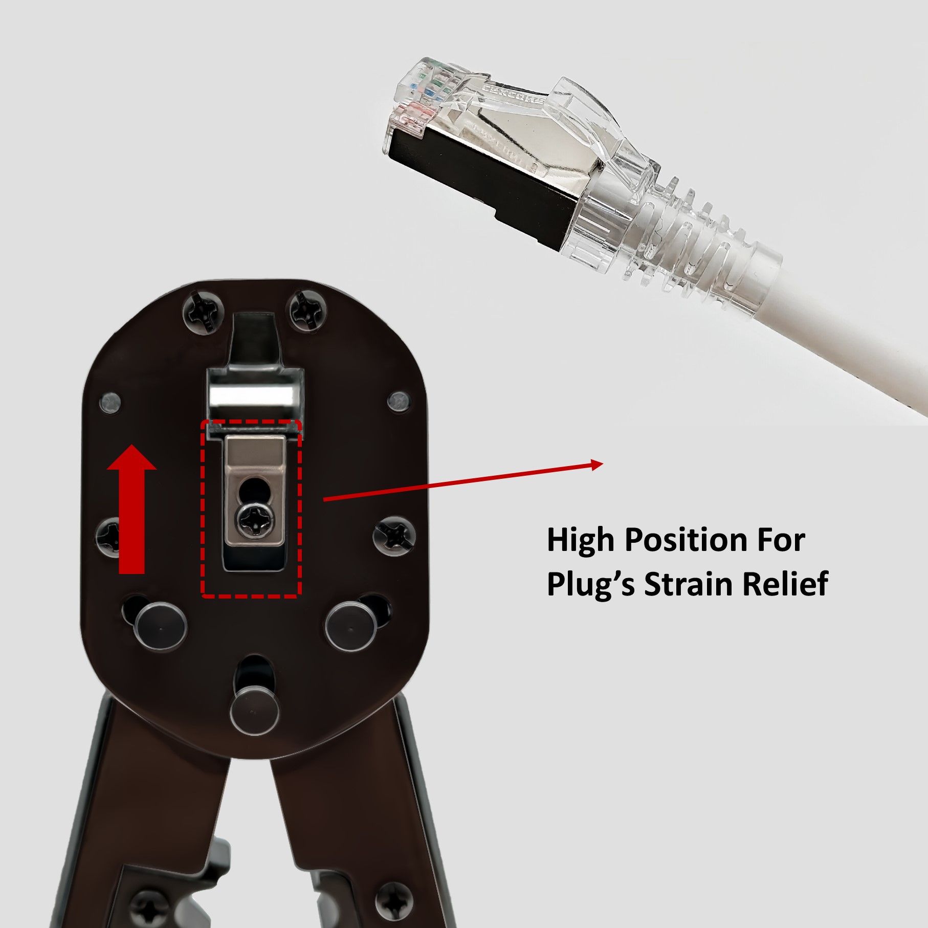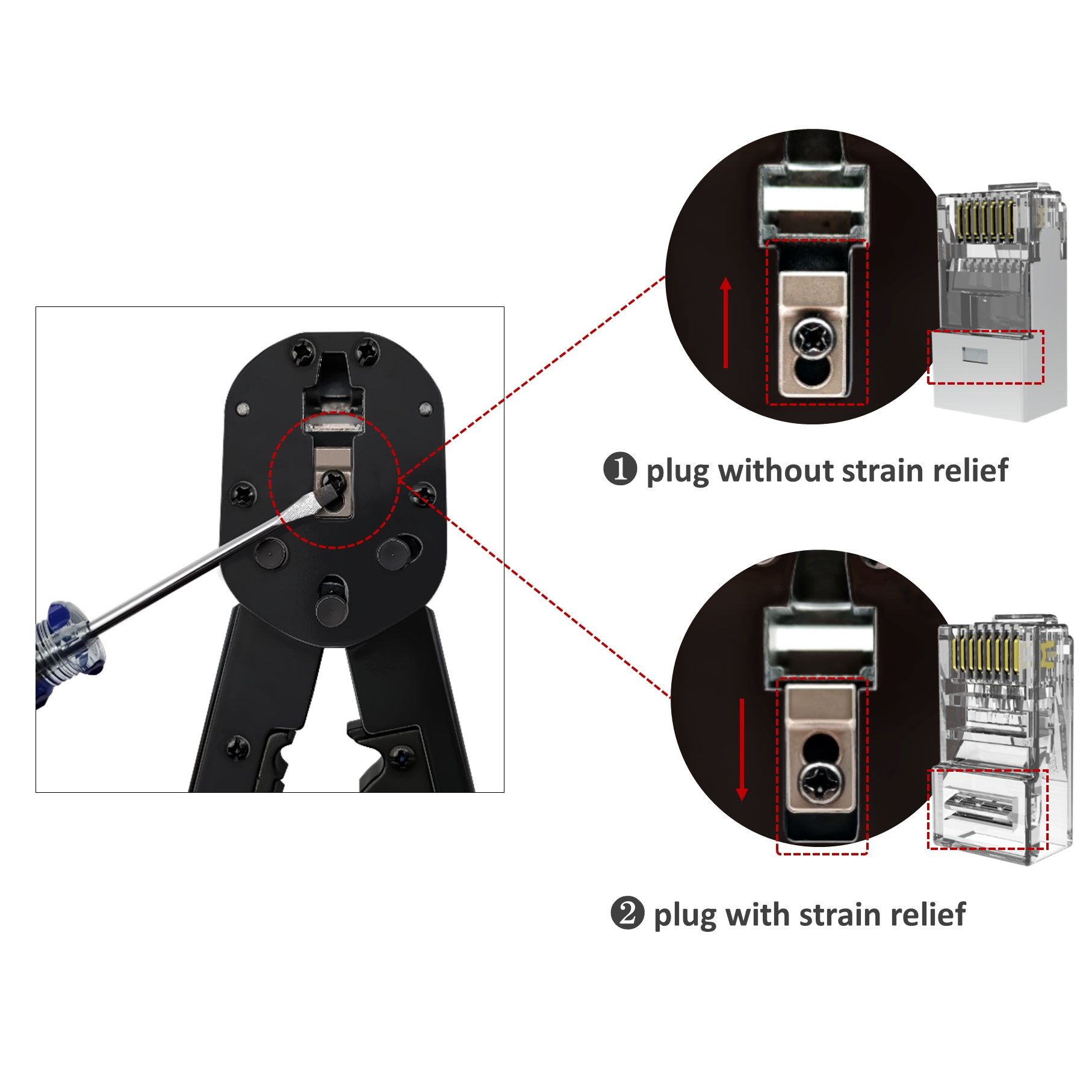 Dieses multifunktionale RJ45-Crimpwerkzeug ist für Stecker mit und ohne Zugentlastung geeignet. Prüfen Sie vor der Verwendung, welchen RJ45-Steckertyp Sie verwenden. Passen Sie die Position des RJ45-Steckers vor dem Crimpen an.