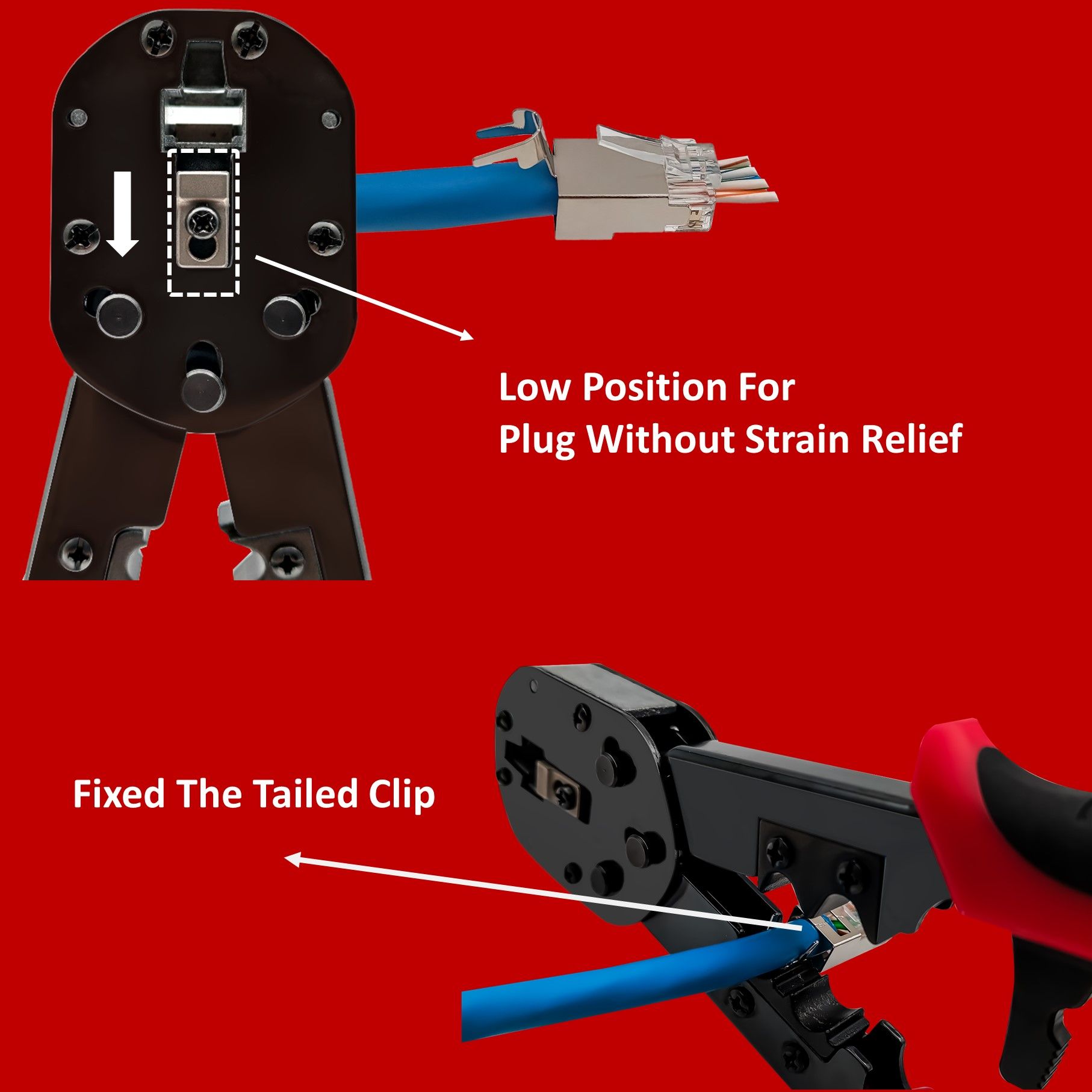 Ein weiteres Merkmal ist die Eignung für die Installation größerer Kabel, insbesondere für Cat.7/Cat.6A RJ45-Stecker mit Kabelklemme. Der mittlere Teil des praktischen Werkzeugs, eine U-förmige Aussparung, dient zum Zusammendrücken der Kabelklemme und fixiert das Kabel sicher. Das 3-in-1-Crimpwerkzeug spart Platz im Werkzeugkasten oder in der Tasche, da nicht mehr viele Einzelteile mitgeführt werden müssen.
