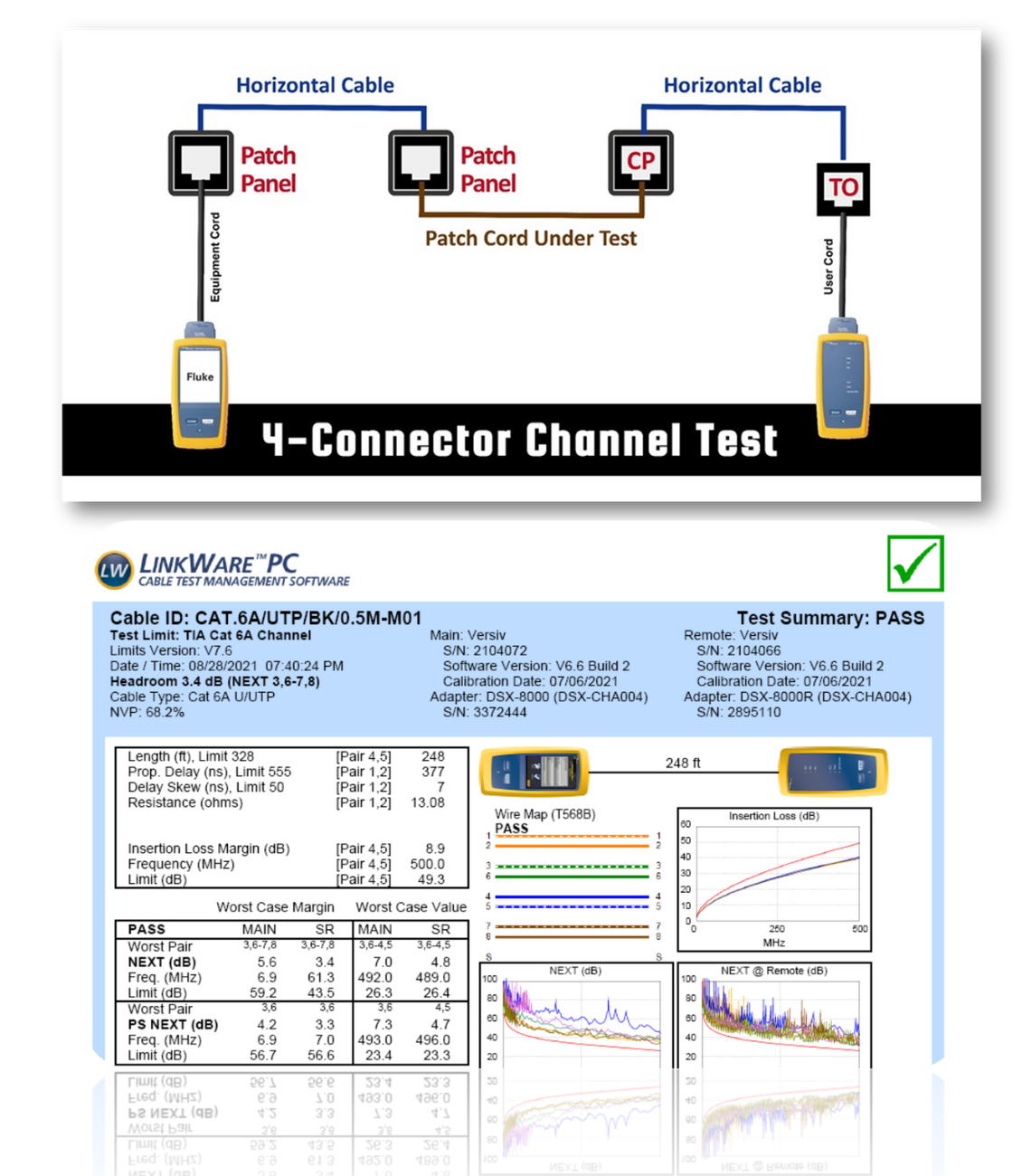 "Channel test" is the whole combined cabling circuit and chained with patch cord, wall plate, horizontal cable, patch panel, and patch cord. The maximum length for this combined cabling circuit is 100m. To imitate the real field cabling system, testing the whole channel performance and transmission speed. If the circuits' result is a "pass" which are suitable for network deployment. Following the below chart, four connectors channel test sets up in cabling environment.