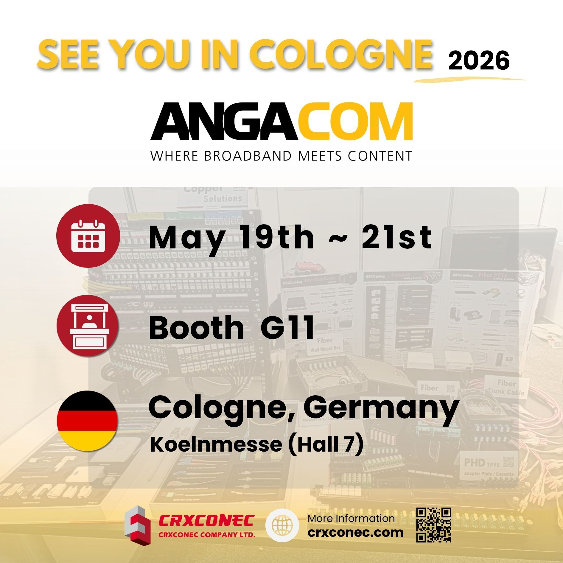 CRXCONEC is excited to participate in ANGA COM 2026 in Cologne, Germany, Europe’s leading business platform for broadband and content providers. From May 19th to 21st, we invite you to visit us at Hall 7, Booth G11 to explore our latest fiber cabling innovations, specifically engineered to support the high-bandwidth demands of the AI era and the strategic needs of global OEM/ODM partners.