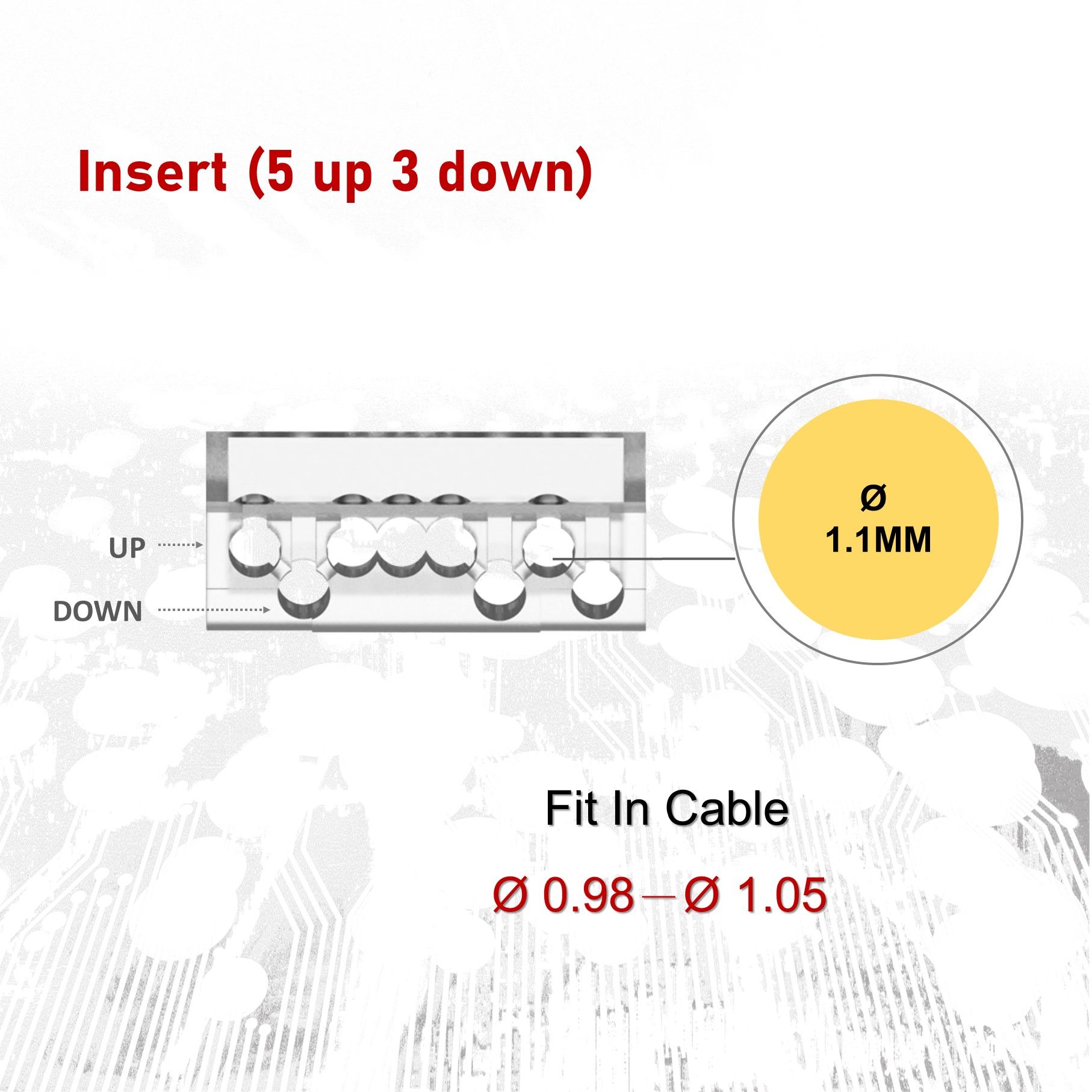 The insert is designed with 5 up 3 down. The staggered position for copper wire reduces the crosstalk between contacts and makes the assembly have better performance. It greatly helps you assemble the RJ45 connector more efficiently. The wire hole is 1.1mm available for 0.96 to 1.02mm solid and stranded cable.