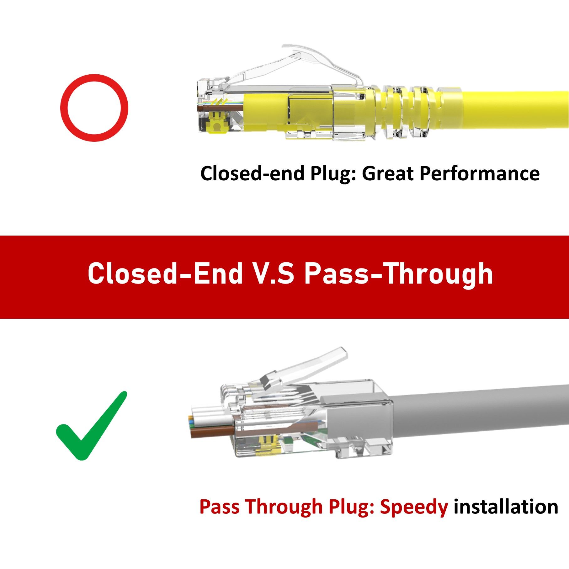 Without doubt, pass through connectors allow the wires to be inserted through the plug and out of the front. The excess wire is trimmed providing a quicker and more efficient experience compared to normal standard plug. The smart easy pass through design makes your installer enhance the produce performance and simplify the installation steps.