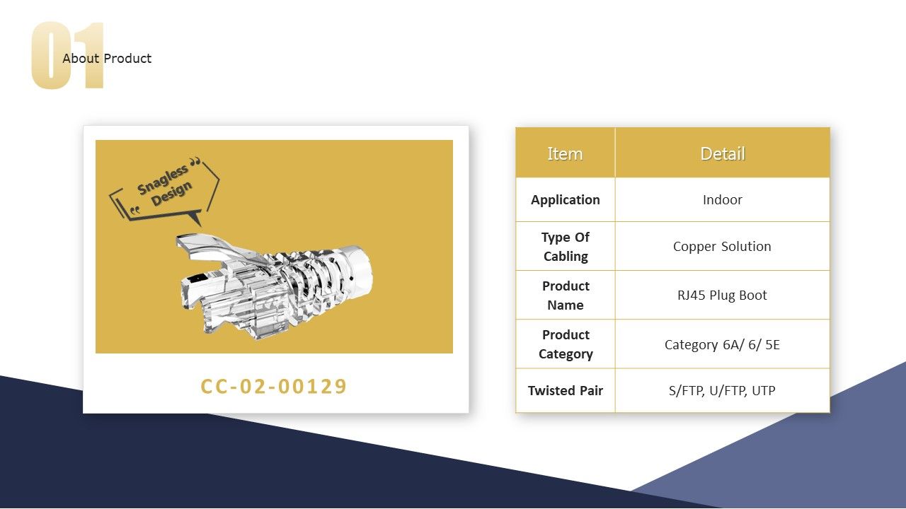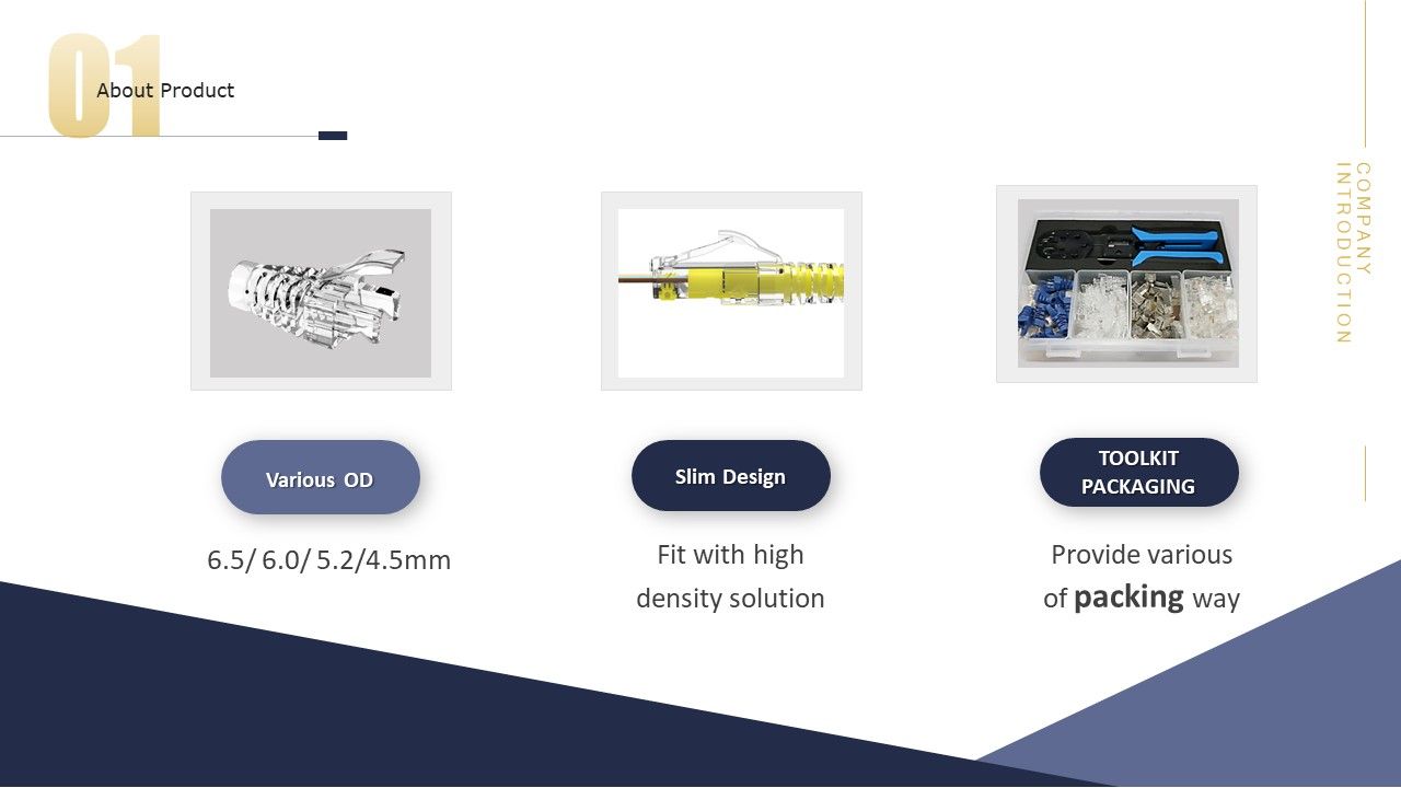 The RJ45 Plug Boots are design to combine with UTP RJ connector or STP RJ modular plug more tightly. Slim boot design can fit with high density panel. Transparent boot can work with different color cable; customers can also reduce wire inventory by using the same RJ45 boot. The RJ connector sleeves are made of PC material, preventing the wire from over bending, and also enhance the strength of the wire. There are various diameters to fit different category of cables.