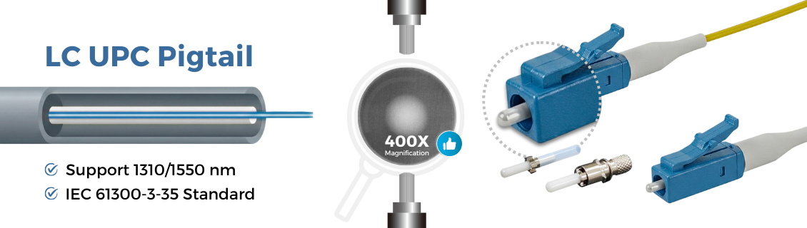 For applications requiring long-term stability and consistent optical performance, the optical quality of an LC UPC pigtail is essential. Our single mode LC UPC pigtails use a high-precision zirconia ceramic ferrule that provides excellent concentricity and fiber alignment, improving coupling efficiency and helping maintain stable loss characteristics across the link. To guarantee uniform surface quality, each connector undergoes end-face inspection at 400× magnification in accordance with IEC 61300-3-35, ensuring the contact zone remains smooth and clean. This level of control supports reliable signal contact and stable optical behavior during transmission. With its precise ferrule construction and rigorous end-face inspection, the LC UPC pigtail delivers consistent optical performance at 1310/1550 nm, making it well-suited for OEM brands requiring reliable, high-quality fiber connectivity.