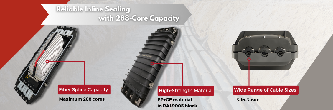 A vízszintes szálas illesztésű burkolat mechanikus tömítéssel rendelkezik, amely 288 magos szálakat képes összekapcsolni az FTTH hálózatban.