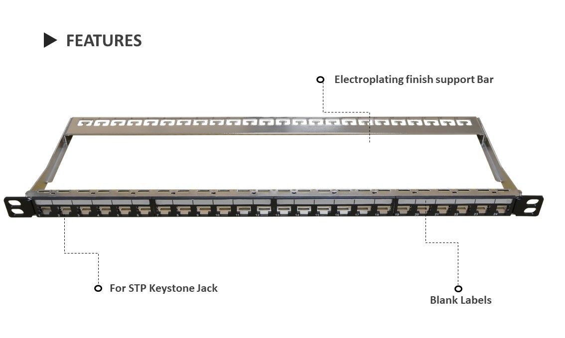 Panel patch STP 24 port berukuran ringkas dengan tinggi standar hanya 0,5U dan identifikasi label putih merupakan desain yang baik bagi para installer untuk melihat nomor port dengan mudah. Bilah manajemen kabel di belakang menjaga kabel patch tetap tertata rapi dan mengurangi kabel yang berantakan. Struktur snap-in panel rak kosong tersedia untuk jack RJ45 keystone atau ethernet coupler, sehingga mudah dipasang dan dilepas dari modul. Panel SPCC berdensitas tinggi mendukung jack Ethernet cat5e, cat6, dan cat6a berukuran standar, menyediakan aplikasi yang lebih fleksibel dan efisien untuk pengkabelan terstruktur.