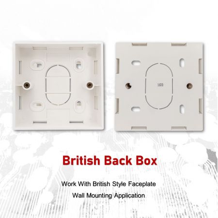 Material British Style Back Box terbuat dari plastik ABS UL94V-0 yang tahan lama, memperkuat fungsi anti-debu dan anti-kabel. Kotak ini dapat dipasang di dinding untuk akses jaringan dan sesuai dengan Faceplate British Style standar.