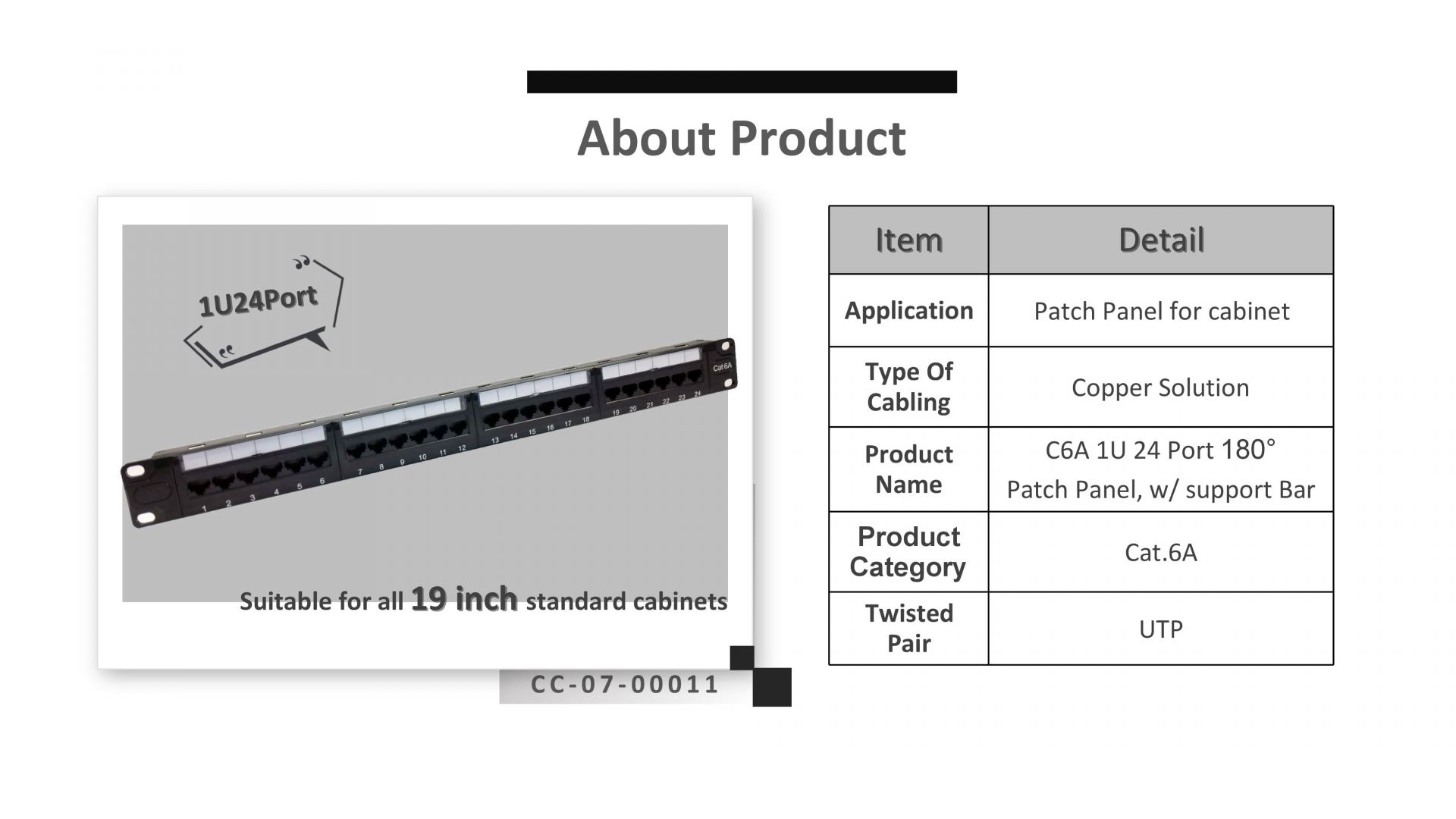 ההפנל יכול להתאים לגודל סטנדרטי של 19 אינץ'חיבור רשתמתלה וארון, תומכים בכבל LAN Cat.6A מ-22 עד 26AWG. כל מודול נבדק במפעל ב-100% ומבטיח ביצועים טובים.