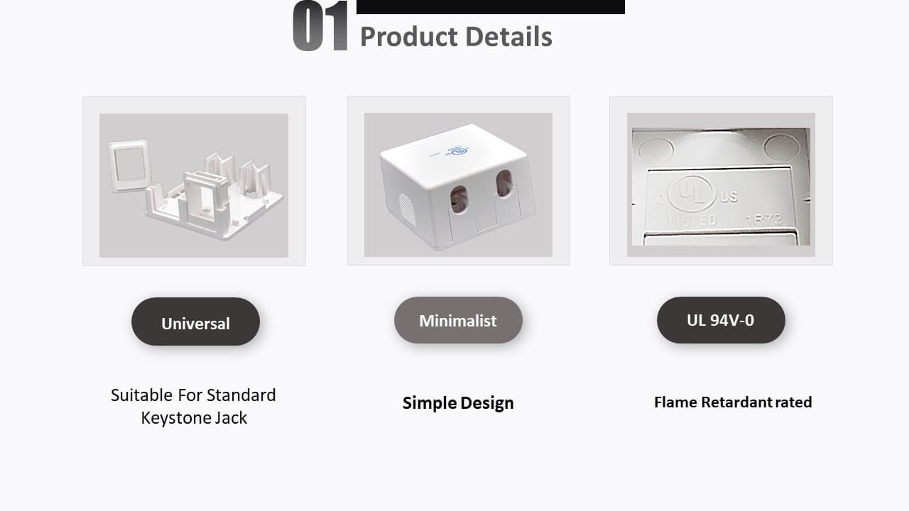 RJ45 עם 2 יציאותשקע קיסטוןניתן להחיל את תיבת השטח עם חיבור התקשורת בהתאם לצורכי המשתמשים כגון שקע RJ45 בזווית של 90 מעלות, תוספות מודול שמע או וידאו. התושבת קלה להתקנה.שקע קיסטוןולהתחבר בקופסה עצמה בלחיצה. בעזרת הסרט הדו-צדדי המצורף, משתמשים יכולים להתקין אתחיבור רשתSMB בצד השולחן או מתחתיו. קופסת RJ45 תומכת בכבל LAN בקוטר של עד 8.0 מ"מ. 2 היציאותחיבור רשתתיבת ההרכבה המשטחית עשויה מ-ABS UL94-V0.