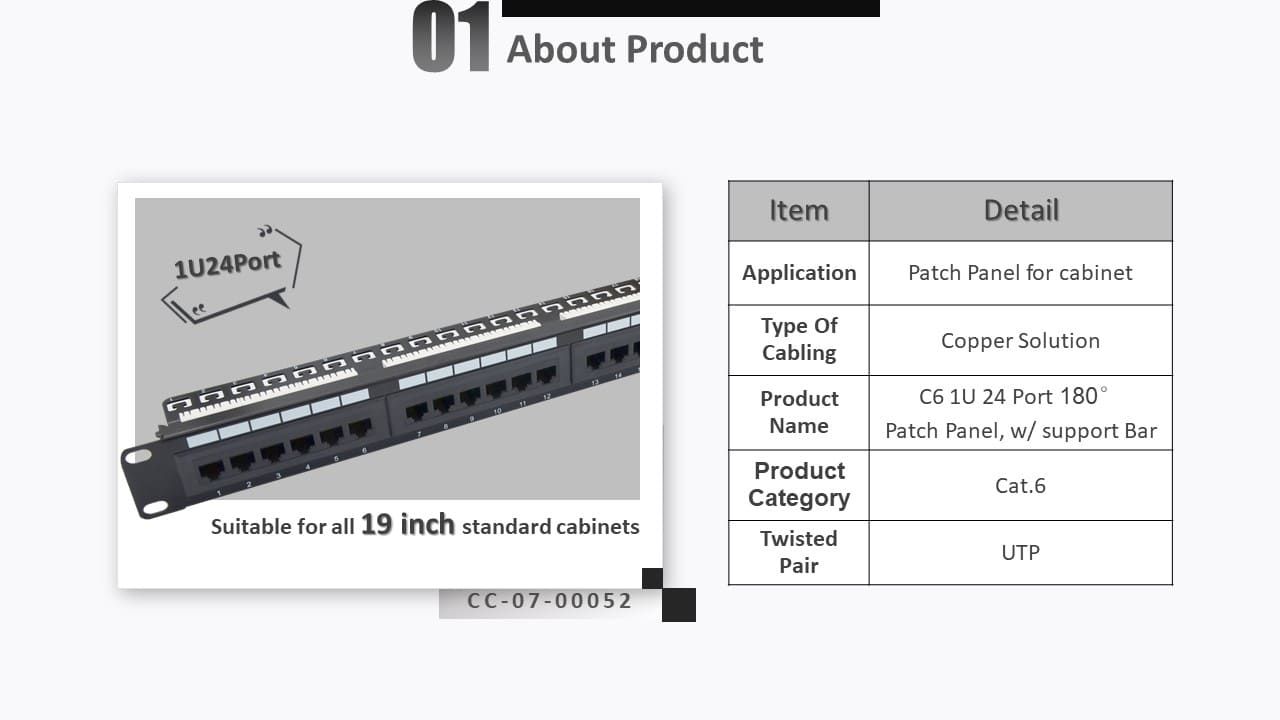 이 패널은 19인치 표준 네트워크 랙 및 캐비닛에 장착 가능하며, 22AWG부터 26AWG까지의 Cat.6 LAN 케이블을 지원합니다. 각 모듈은 공장에서 100% 테스트되었으며, 성능을 보장합니다. 포트 번호는 지지대와 전면 플레이트에 명확하게 표시되어 있으며, T568A/T568B 색상 코드는 패널 뒷면에 표시되어 있습니다.