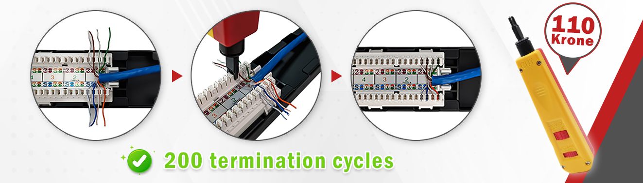 이 RJ45 패치 패널 12포트는 후면 110 IDC와 함께 사용되어 빠르고 간편한 펀치다운 종단 작업이 가능합니다. 110 크로네 타입 펀치다운 도구를 사용하면 설치 효율이 향상됩니다. Cat6 12포트 패치 패널은 UL 규격에 따라 최대 200회의 종단 작업을 큰 문제 없이 견딜 수 있습니다.