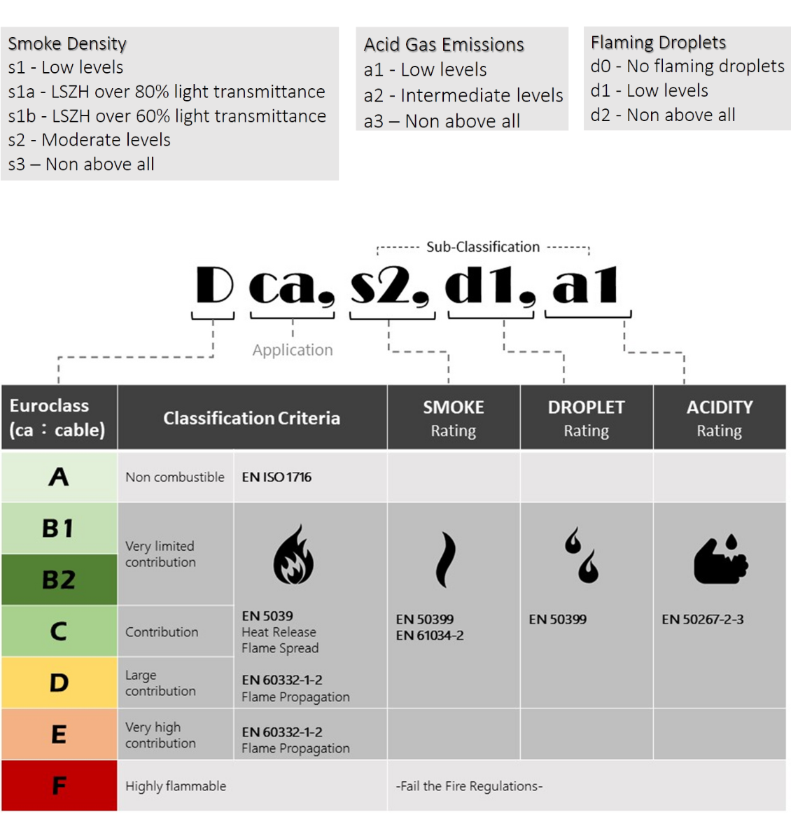 Piawaian EN 50575 menentukan keperluan untuk prestasi kebakaran kabel, dikelaskan dalam 7 Euroclasses mengikut sumbangannya kepada kebakaran: Aca, B1ca, B2ca, Cca, Dca, Eca dan Fca. Kriteria klasifikasi utama ialah penyebaran nyalaan dan pelepasan haba.