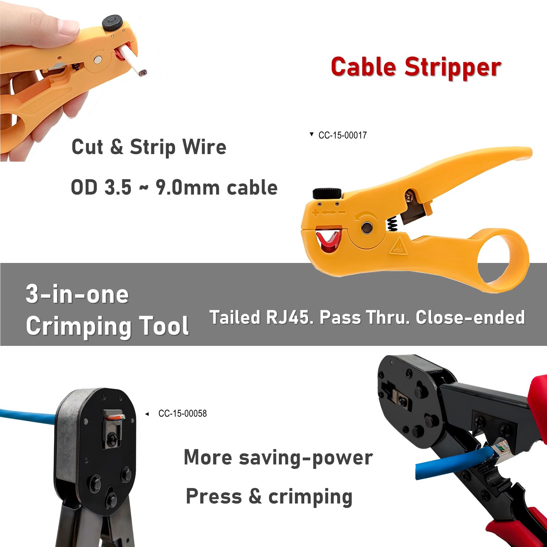 Untuk pemasangan mudah, kami cadangkan anda menggunakan dua alat berguna untuk melakukan pemasangan Penyambung RJ45 8-Pin. Satu adalahKablePenanggal untuk menanggalkan dan memotong wayar, dan satu lagi berfungsi 3-dalam-1Penyambung RJ45Alat Pengelim untuk mengelim bilah sesentuh. Pengelim RJ45 sesuai untuk penyambung RJ45 pass-through, bukan pass-through dan penyambung klip berekor.