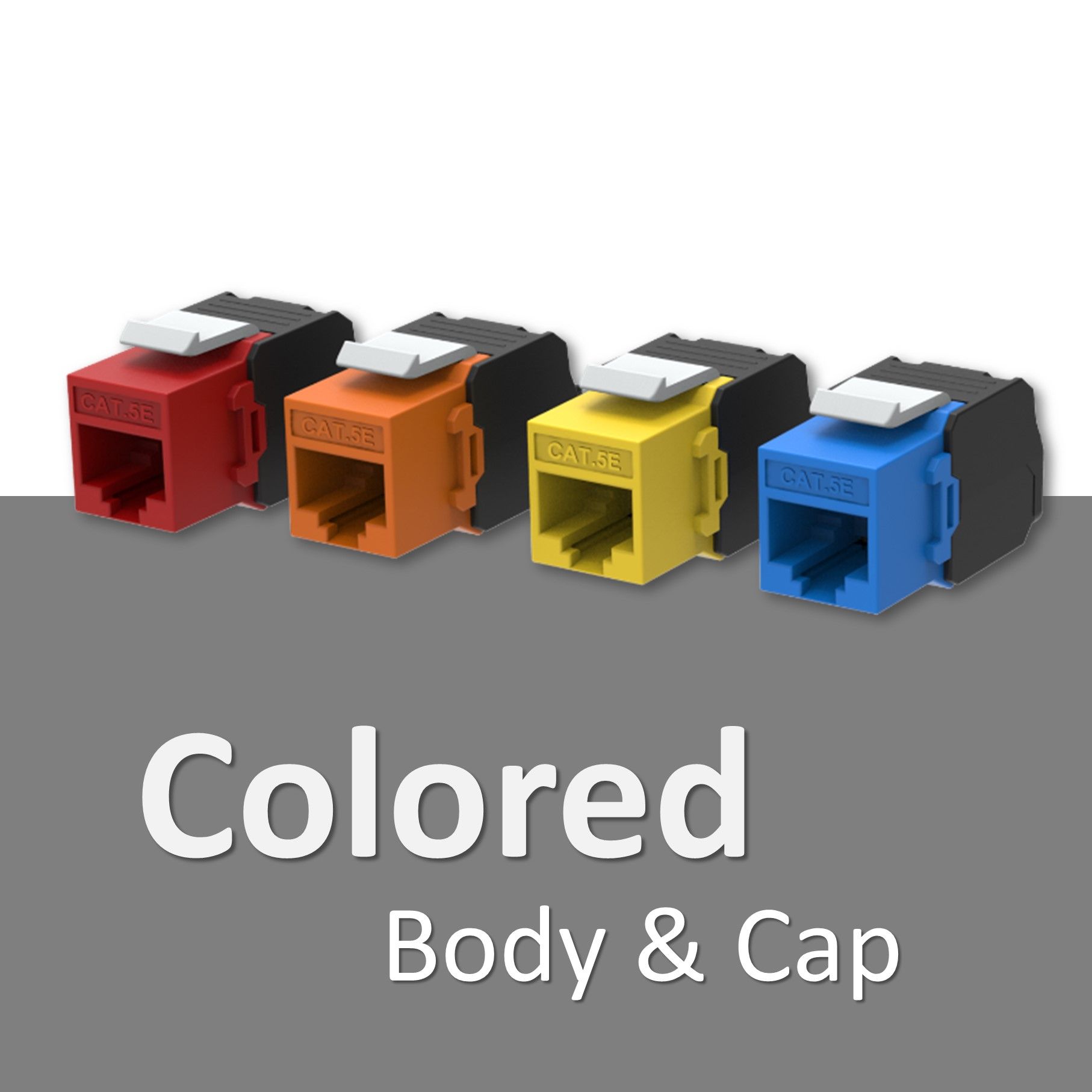 Om je eigen kleurrijke, onafgeschermde Cat5E keystone-aansluiting te maken, kun je twee delen van de keystone-aansluiting inkleuren. Eén deel bevindt zich bij de voorste poort en het andere deel bevindt zich aan de achterkant, bij de IDC-module. Je kunt ook één kleur kiezen voor de hele behuizing van de keystone-aansluiting en verschillende kleuren op de dop aanbrengen.