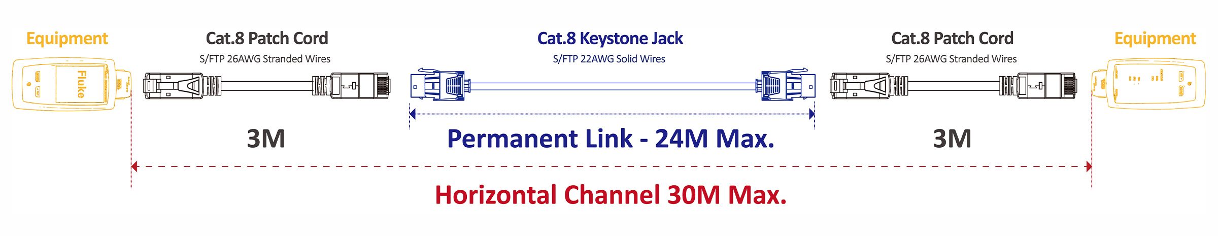 De Cat.8-kanaalverbindingen zijn onafhankelijk gecertificeerd door het gerenommeerde GHMT-laboratorium in Duitsland, gebaseerd op 2 connectorkanalen onder 30 m en voldoen aan de norm van klasse I ISO/IEC 11801-1 Ed.1.0 (2017-11) DIN EN 50173-1 (2018-10). Het geteste monster omvat een complete Cat8-bekabelingsoplossing, inclusief Cat8 SFTP-massieve kabel, Cat8-patchkabel en Cat8-keystone-aansluiting.