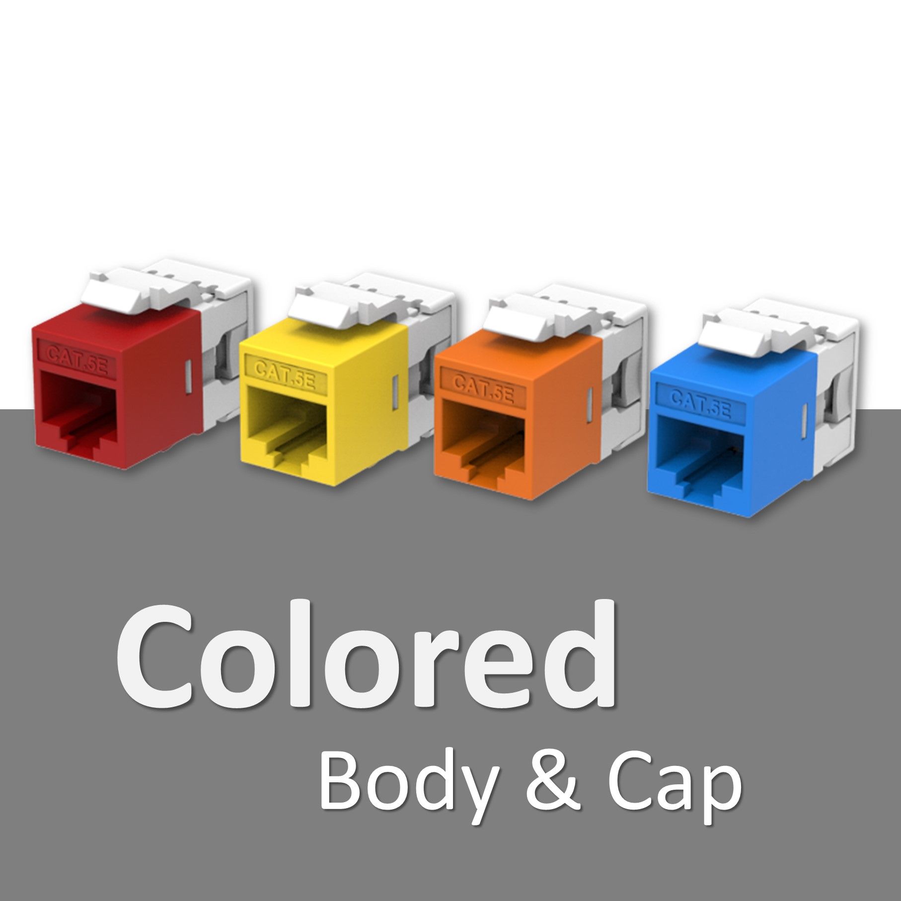 Er zijn talloze kleuren beschikbaar om je eigen onafgeschermde punch-down keystone jack te maken. Je kunt twee delen van de keystone jack kleuren: één bij de voorste poort en één aan de achterkant met de IDC-module. Je kunt ook één kleur kiezen voor de hele punch-down keystone jack en verschillende kleuren op de dop aanbrengen.