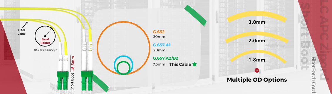 CRXCONEClevert LC APC single-mode glasvezel patchkabels met manteldiameters van 1,8 mm, 2,0 mm en 3,0 mm voor een betere aansluiting op verschillende projectbehoeften, met name in krappe ruimtes. Onze LC SM APC glasvezel patchkabels zijn uitgerust met buigbestendige G.657.A2 glasvezel en een korte laars en bieden de flexibiliteit die nodig is voor diverse installatieomgevingen. Zelfs in volle racks of panelen met een hoge dichtheid kunnen installateurs eenvoudig een schone, stabiele en betrouwbare bekabeling realiseren.