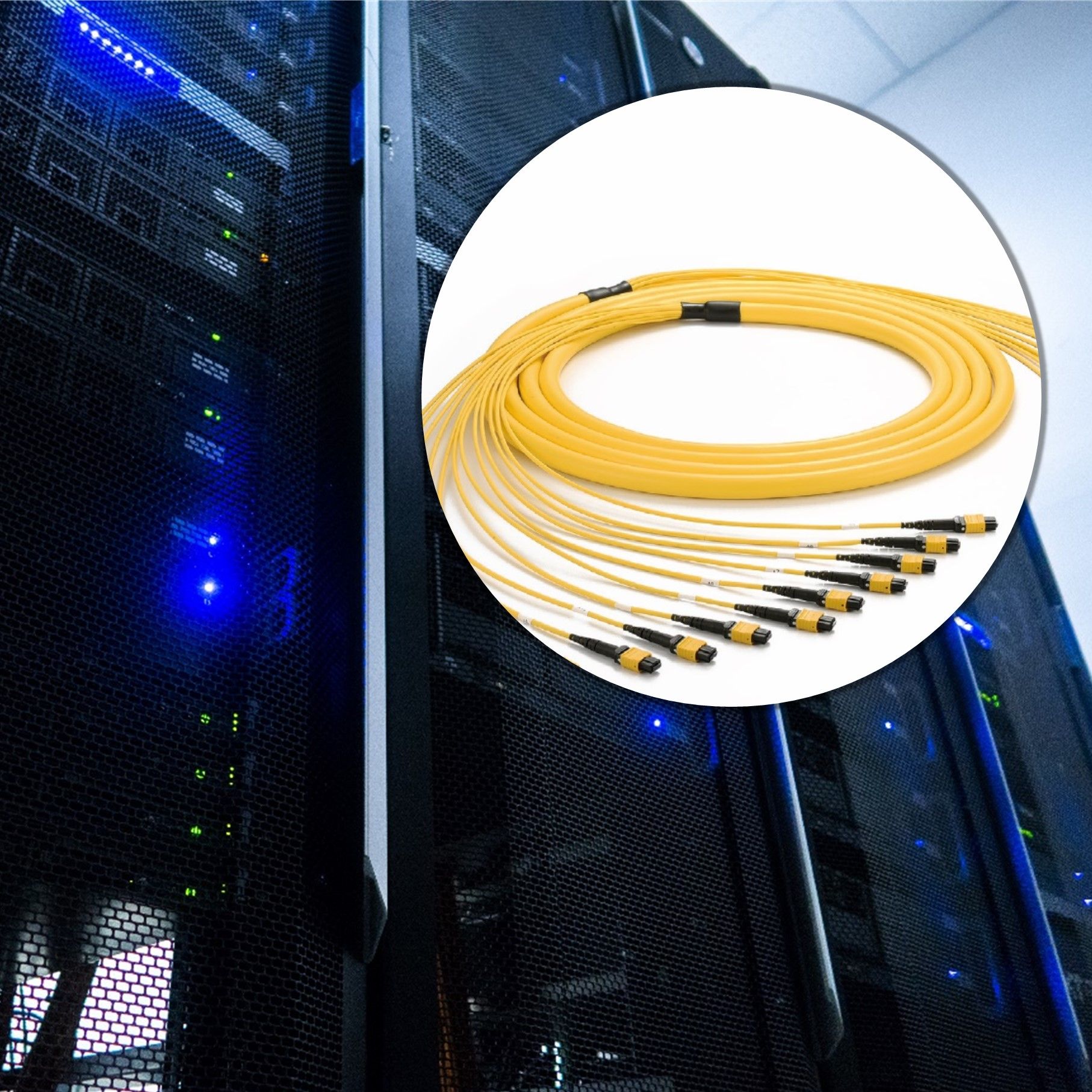 De glasvezelkabels zijn gemaakt van MTP® en MPO en hebben 12 glasvezelconnectoren die aansluiten...