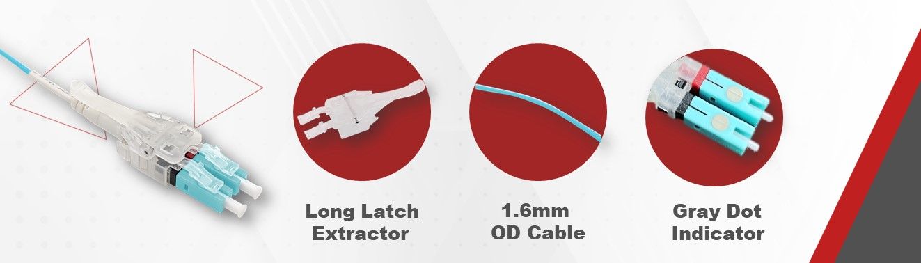 Voor toepassingen met hoge dichtheid wordt het OM3 LC-vezelkoord gebruikt met een lange vergrendelingstrekker