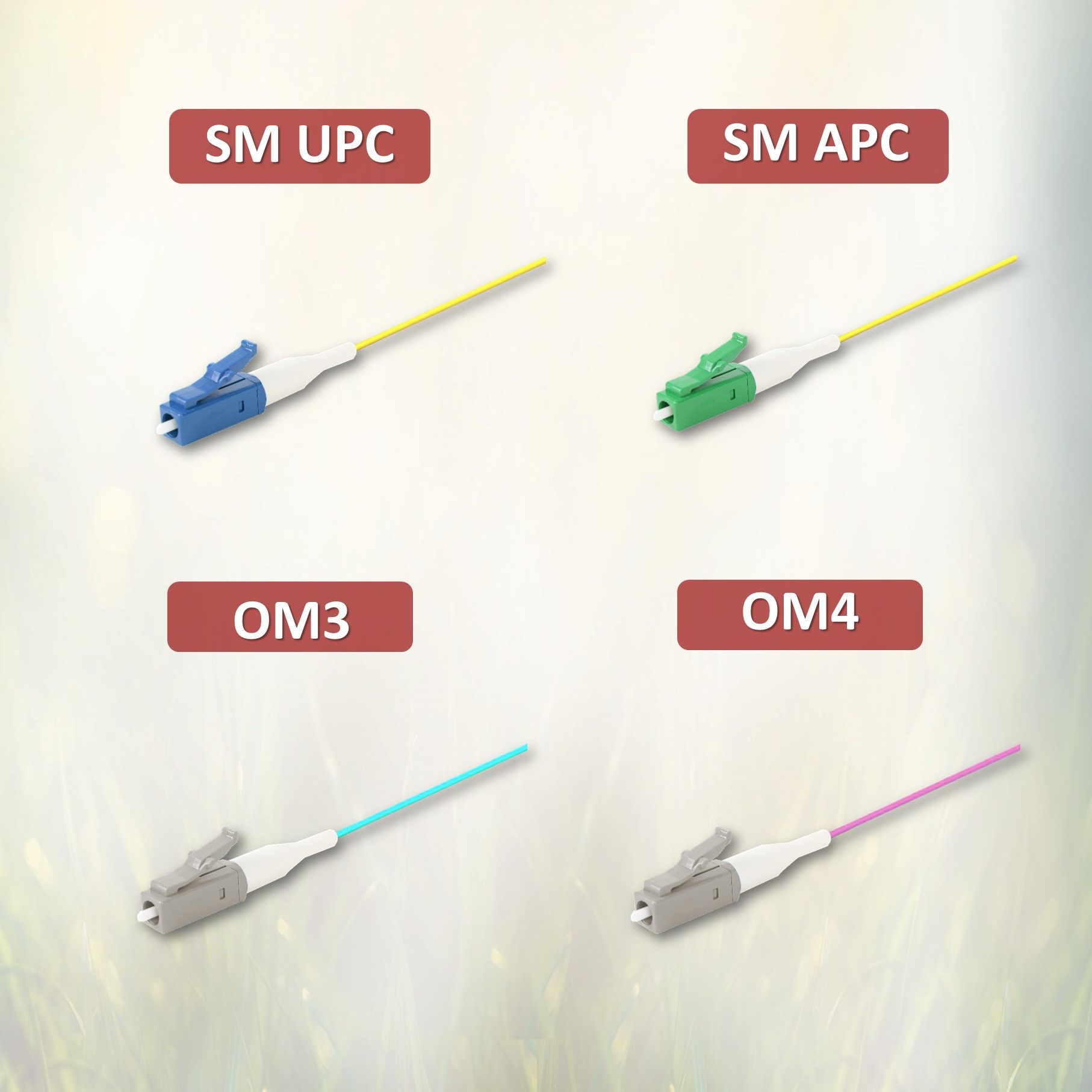 De LC glasvezel pigtailkabels zijn verkrijgbaar met aangepaste glasvezelconnectoren, zoals single-mode pigtail (APC, UPC) en multi-mode pigtail OM1, OM2, OM3, OM4 en OM5, die buigongevoelig zijn. Bovendien kunt u de lengte van de LC glasvezel pigtail aanpassen aan de vereisten van uw bekabelingssysteem.