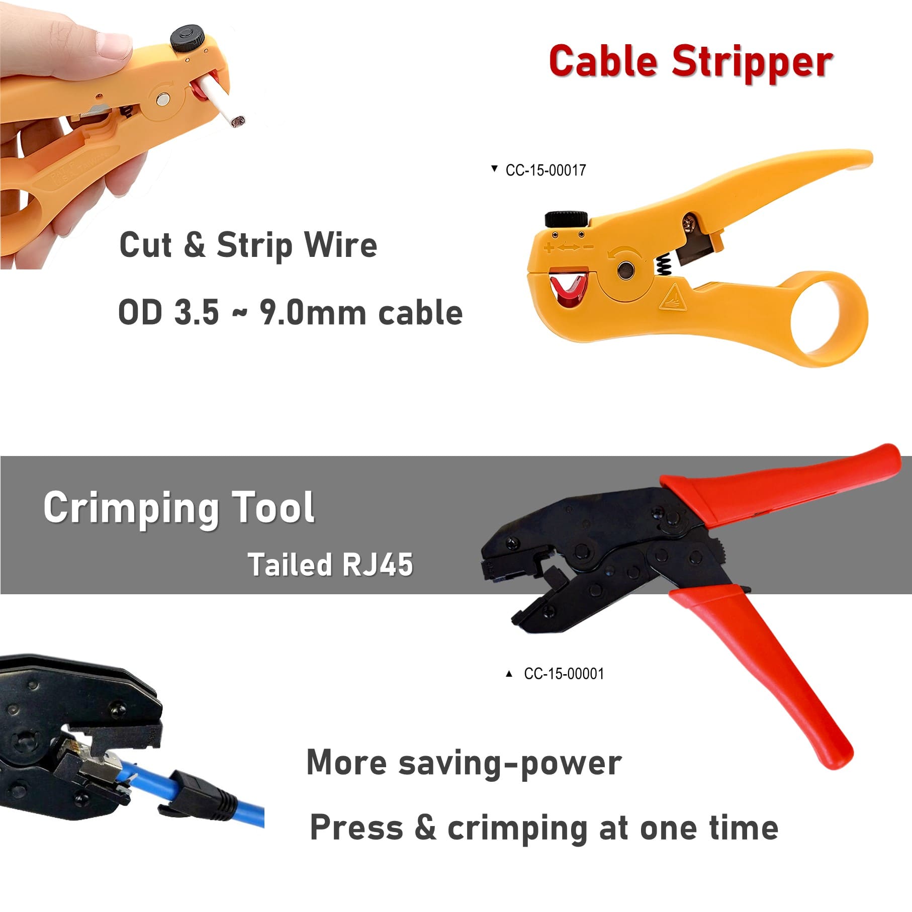 Dla ułatwienia montażu zalecamy użycie dwóch poręcznych narzędzi do instalacji złączy RJ45 z ogonkami do większych kabli. Jedno to ściągacz izolacji do kabli, który służy do zdejmowania izolacji i cięcia przewodu, a drugie to zaciskarka do złączy RJ45 z ogonkami, która służy do jednoczesnego zaciskania styków i zaciskania zacisku.