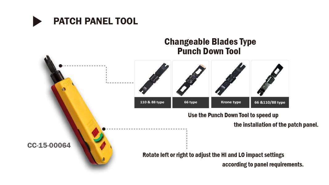 Panel krosowy RJ45 typu Punch Down wyposażony jest w tylne złącze IDC 110, co umożliwia szybkie i łatwe podłączanie przewodów. Ustawienia udaru HI i LO pozwalają użytkownikom dostosować je do wymagań panelu. Precyzyjne ostrza są wymienne i odwracalne, co pozwala na obsługę różnych typów przewodów. Za pomocą jednego narzędzia instalatorzy mogą dociskać przewody i przycinać nadmiar, zapewniając czyste i precyzyjne cięcie, co czyni go idealnym rozwiązaniem do podłączania paneli krosowych.
