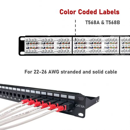 Na przedniej płycie panelu złączy, porty RJ45 są bezpośrednio podłączone do kabla Ethernet UTP. Dostępny jest on dla przewodów litych i linkowych o przekroju 22-26 AWG. Z tyłu znajdują się kolorowe oznaczenia do podłączania kabli Ethernet. Kolorowe etykiety są przeznaczone do konfiguracji okablowania T568A i T568B.