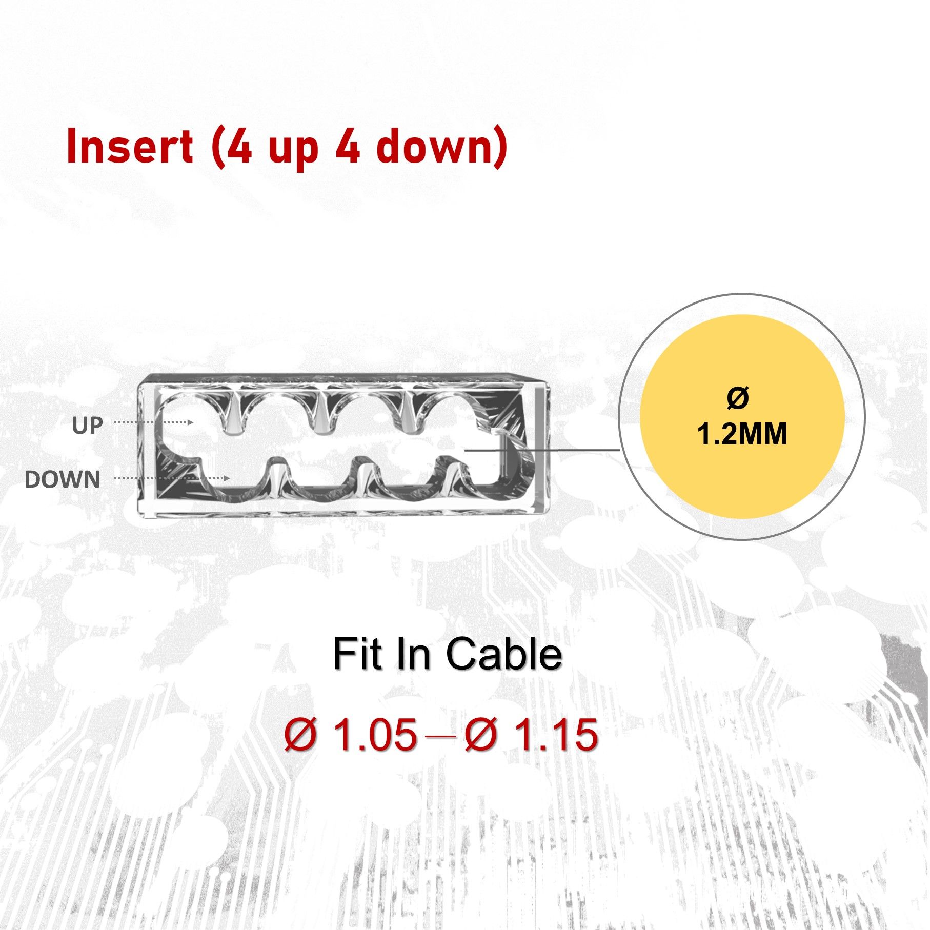- Större kabelhål: 1,2 mm kan passa 23 ~ 26AWG större kabeldiameter