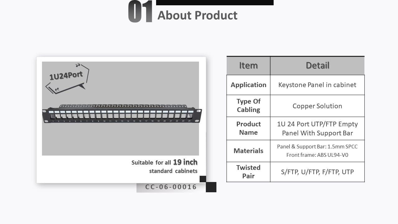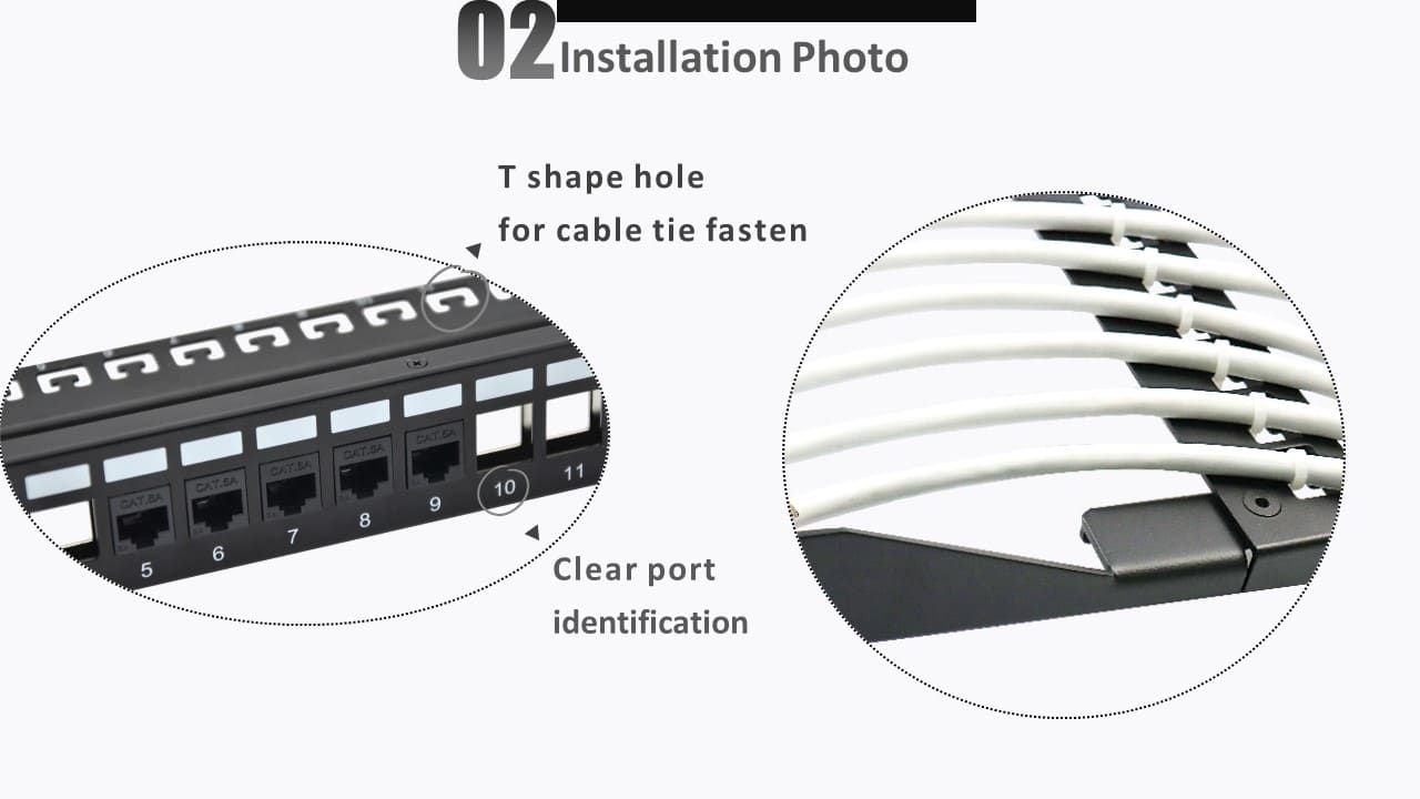 Den tomma panelen passar vanliga 19-tumsskåp och rack under strukturerad c6a-, cat6- och c5e-kablage, och stöder skärmad och oskärmad LAN-kabel.