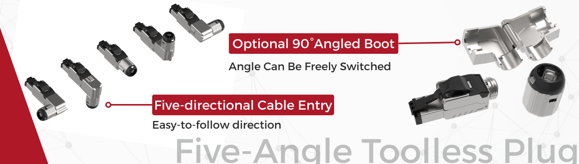 90° Opsiyonel Önyüklemeli Beş Açı Aletsiz RJ45 Konnektörü